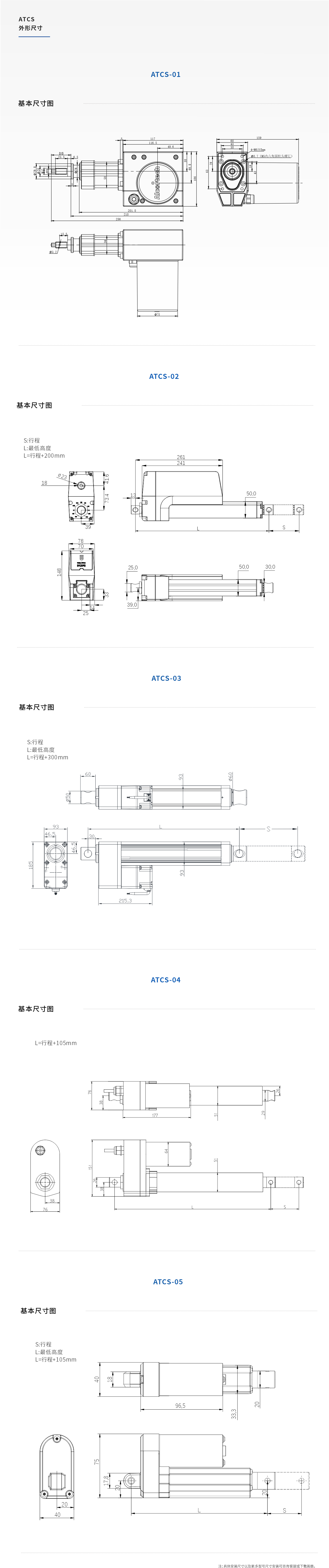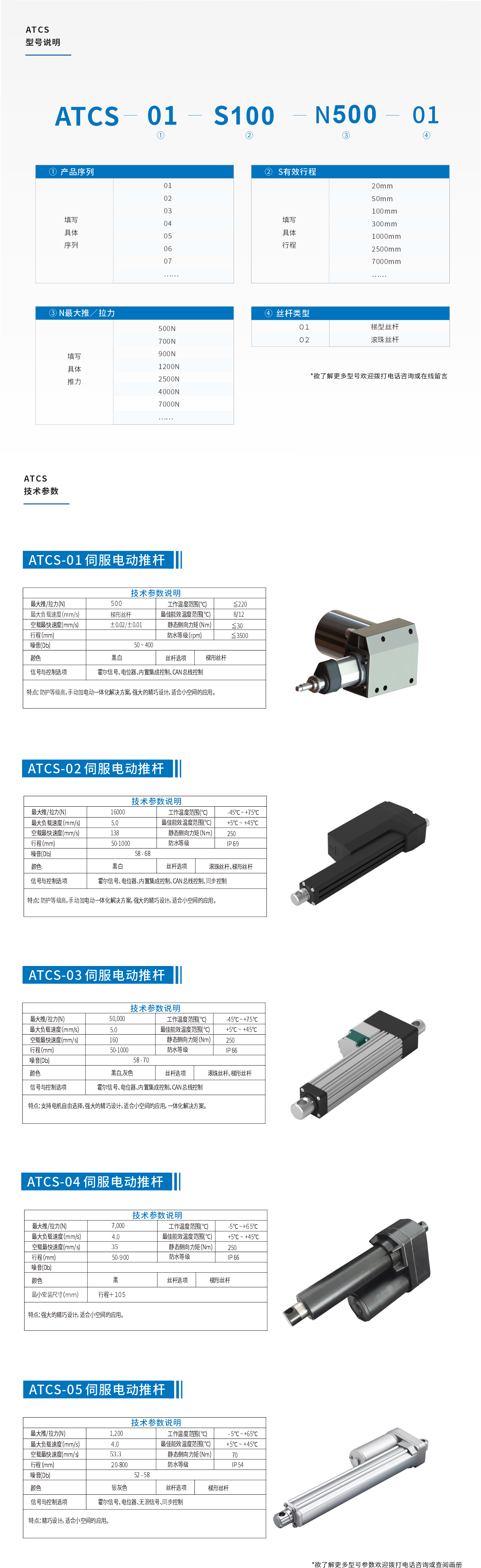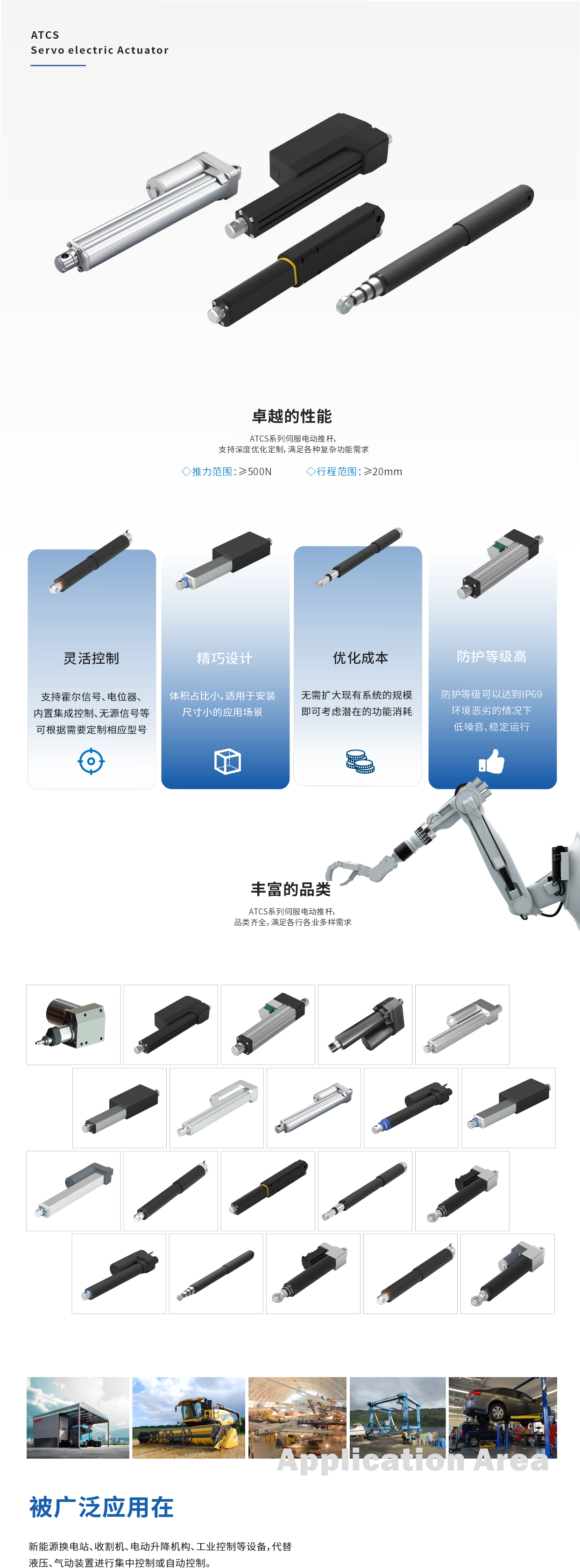 ATCS 系列伺服電動推桿是一種直行程往復執行元件,其主要由電機、蝸輪桿、推桿、外殼本體等部件構成,精巧設計,適合狹小空間的電動伸縮應用。